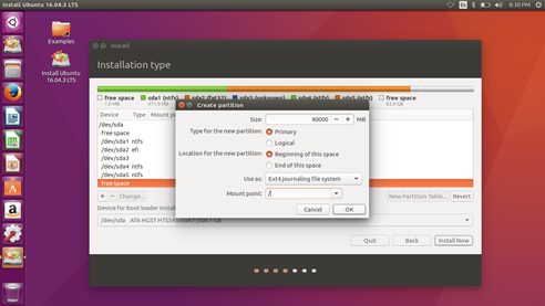 8. Terdapat proses pembuatan partisi dengan mengatur size, dan pilih use Ex4 journaling file system, untuk mount pint diisi dengan /.