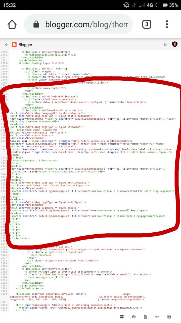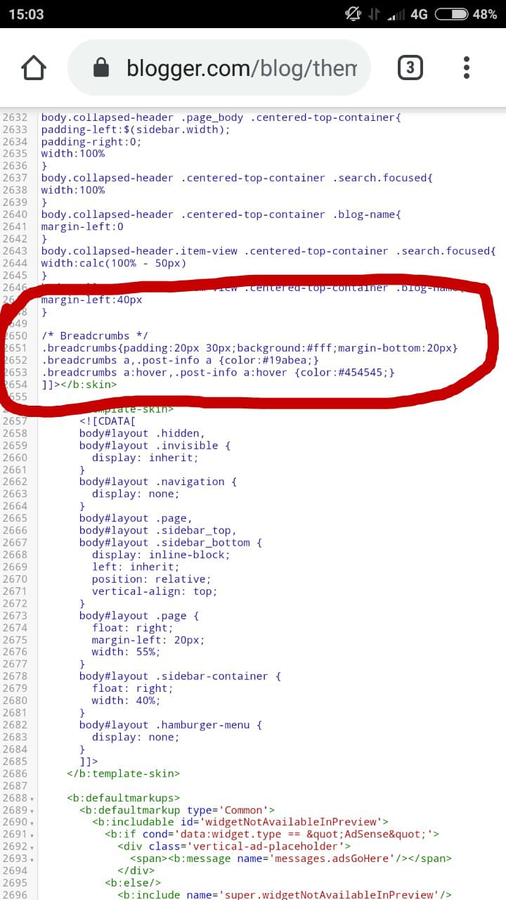 4. Copy dan Pastekan kode Breadcumbs di bawah ini tepat sesudah kode tadi.