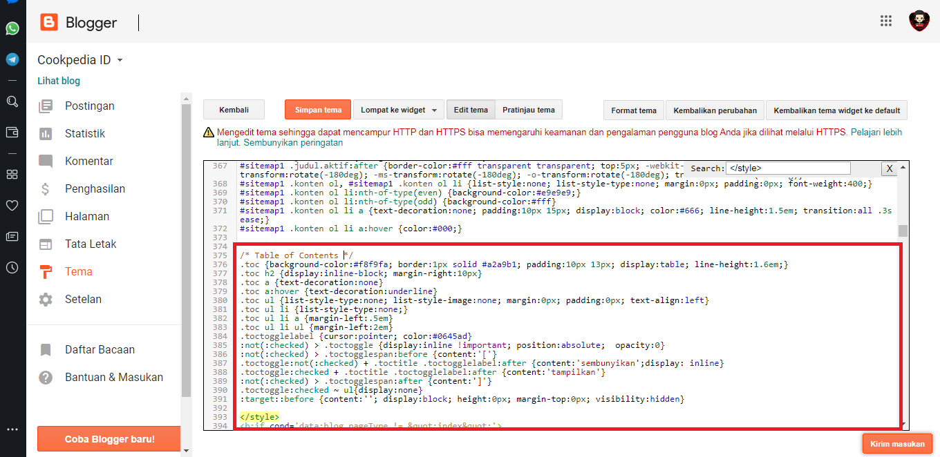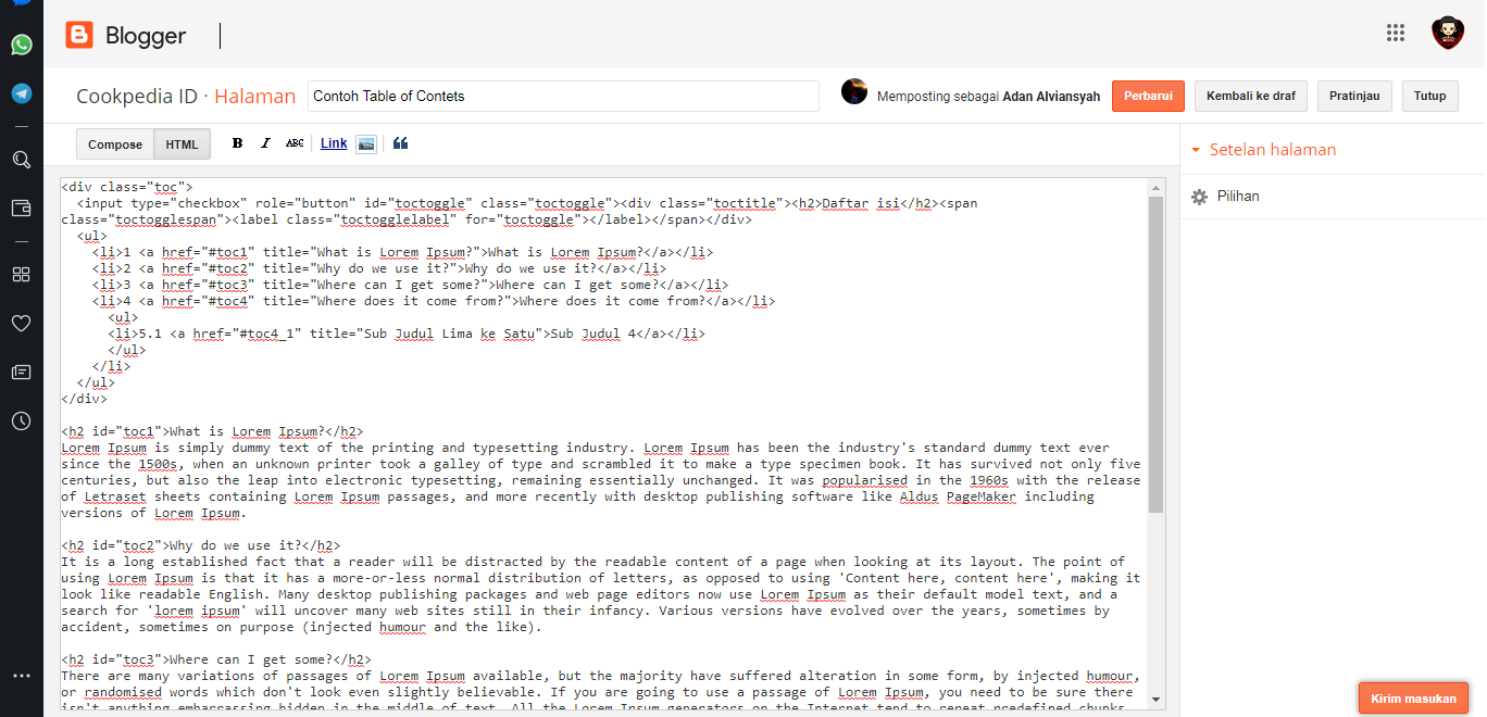 Pada umumnya Table Of Contents atau Daftar Isi sering kita jumpai pada E-Book, buku bentuk fisik, atau situs website pribadi mau pun team. Untuk memasang Table Of Contents pada website pribadi, terutama jika menggunakan CMS Wordpress sangat mudah untuk memasangnya, karena sudah ada plugin sendiri. Namun jika untuk CMS Blogger berbeda, kita harus memasangnya secara manual.