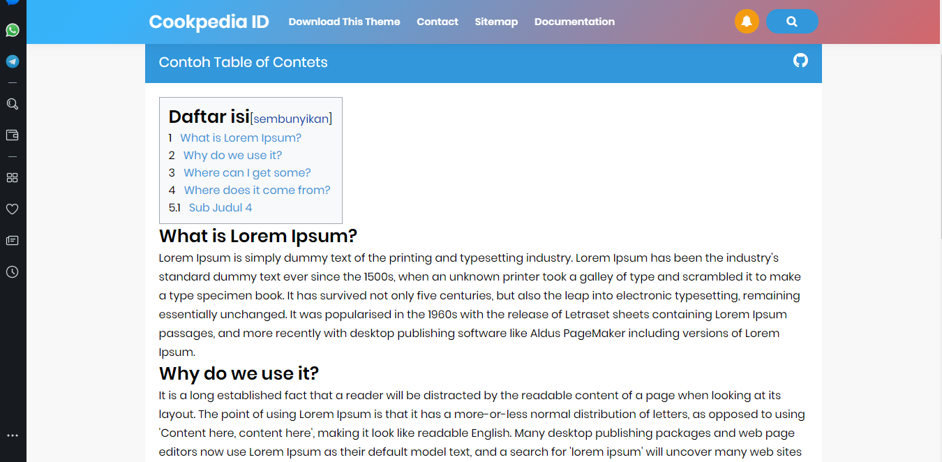 Table Of Content atau Daftar Isi merupakan daftar rincian dari sebuah artikel. Singkatnya, Table Of Contents ini memiliki fungsi untuk menampilkan rincian dari isi artikel dalam bentuk link yang akan mempermudah pembaca mendapatkan poin penting dari artikel itu.