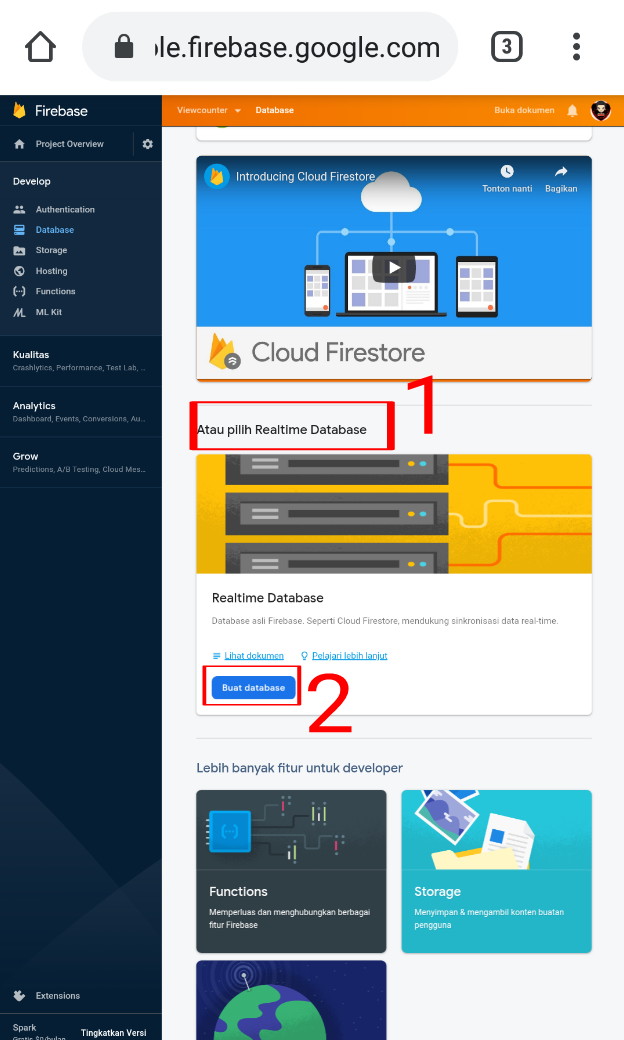 4. Scroll atau geser ke bawah dan pilih menu Real time dan buat Database baru.