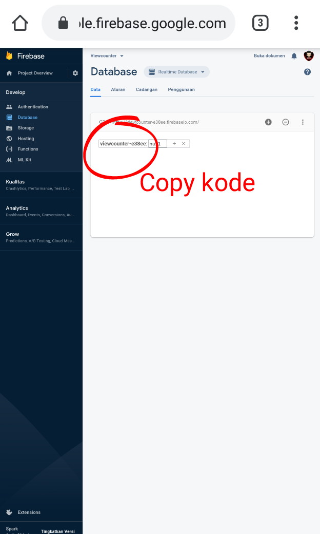 6. Selanjutnya kamu copy kode ID Firebasenya ke dalam notepad terlebih dahulu.