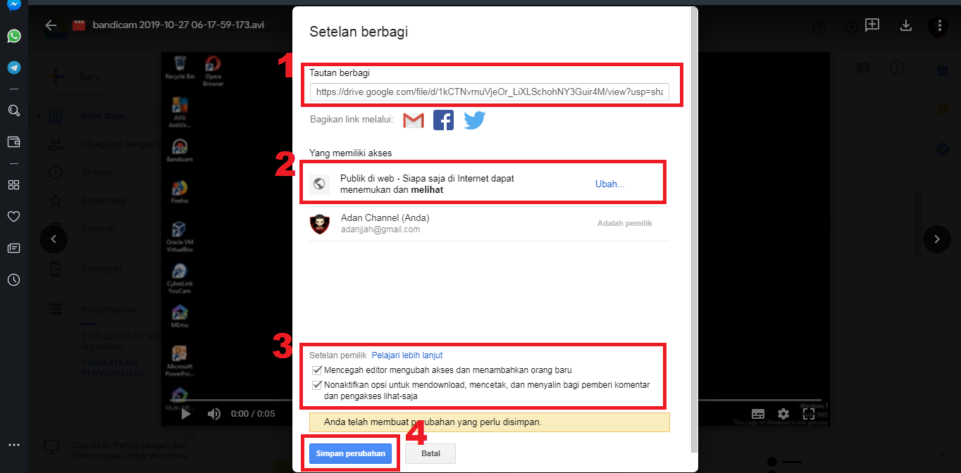 8. Akan muncul Popup besar. Kamu bisa Copy dan Paste URL nya di notepad dahulu – Lalu kamu ubah aksesnya dari Pribadi menjadi Publik. Atau kamu bisa ikuti settingannya seperti gambar di bawah. Jika sudah selesai. Selanjutnya pilih Simpan Perubahan.