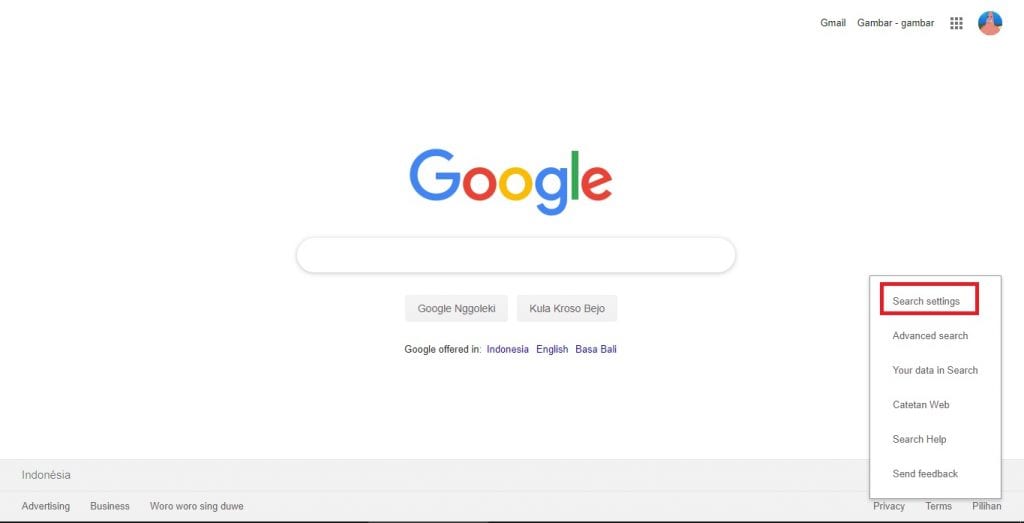 2. Untuk PC/Laptop, pada situs Google.com di bagian kanan bawah pilih tulisan Pilihan, kemudian pilih Search Settings.