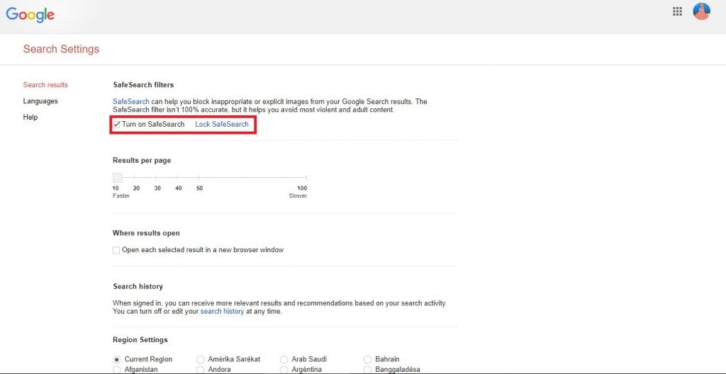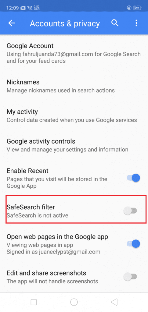 9. Pada menu Account and Privacy, klik Safe Search Filter sampai centangnya hilang.