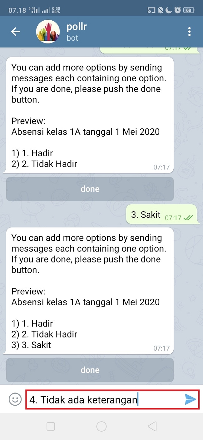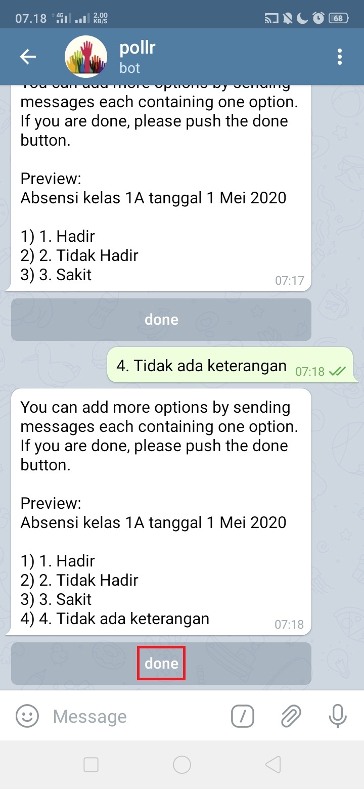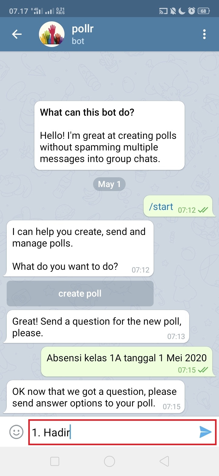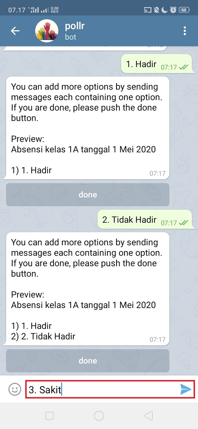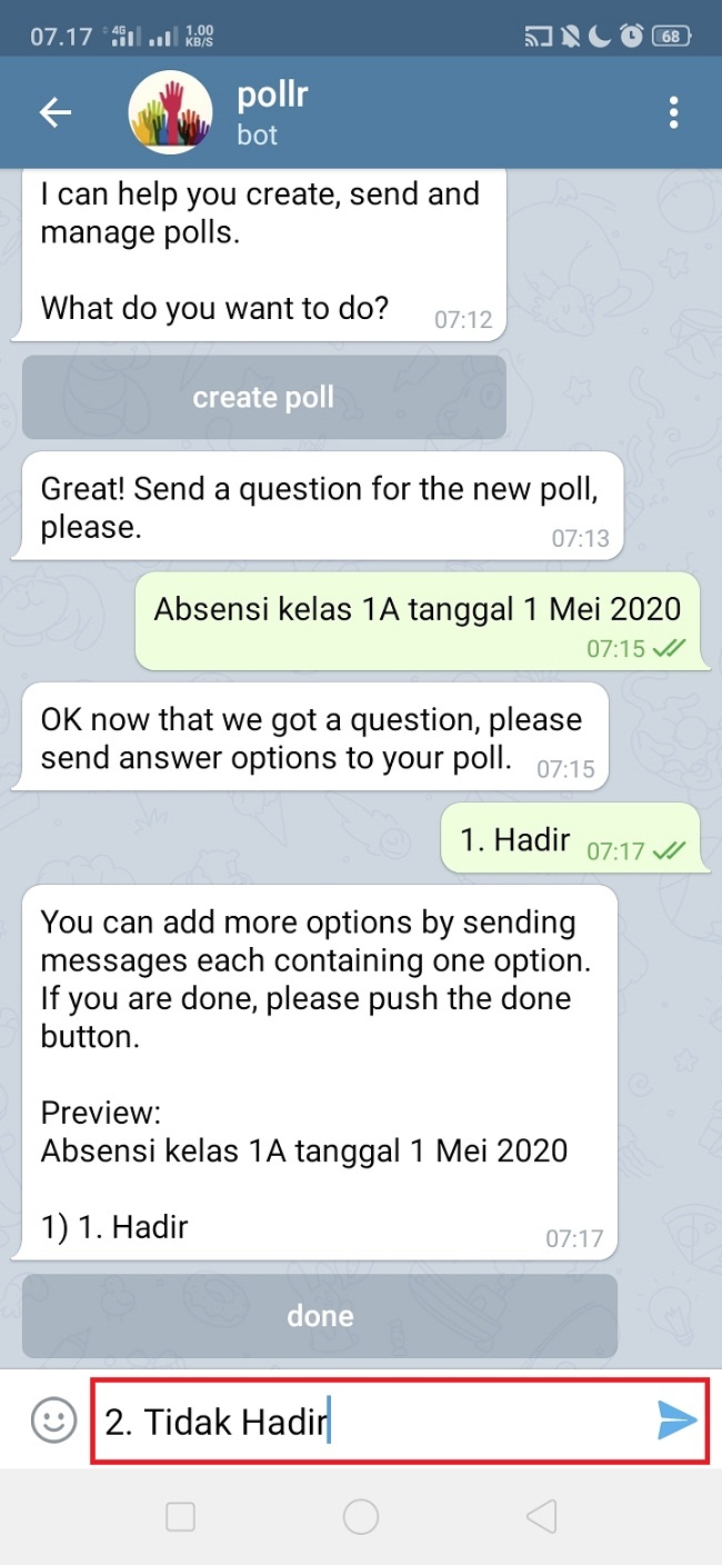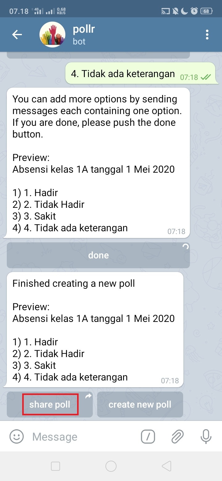 9. Klik tombol share poll untuk membagikan absensi kehadiran di group kelas Telegram.