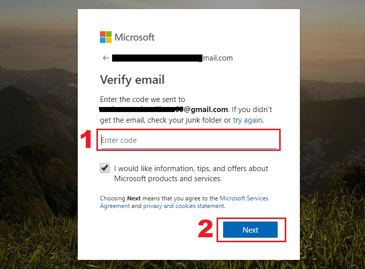 5. Buka kotak masuk di Gmail kamu, maka akan ada pesan verifikasi dari Microsoft account team, di dalam pesan tersebut, terdapat sebuah angka 4 digit, masukkan angka tersebut (1) dan klik Next (2).