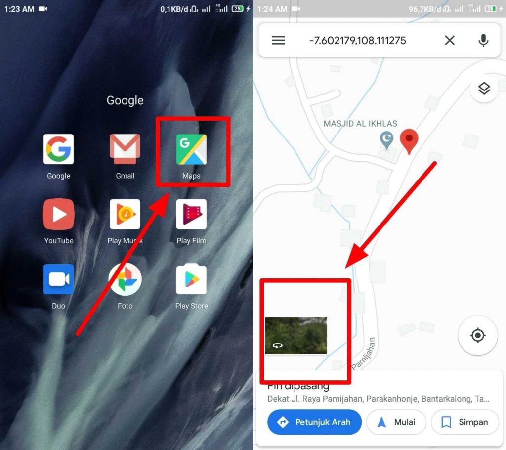 1. Buka aplikasi Google Maps di smartphone kamu, lalu buat titik kordinat denah lokasi yang akan dibuat barcode dengan cara menekannya hingga muncul street view jalan yang bisa kamu buka dengan tampilan 360°.