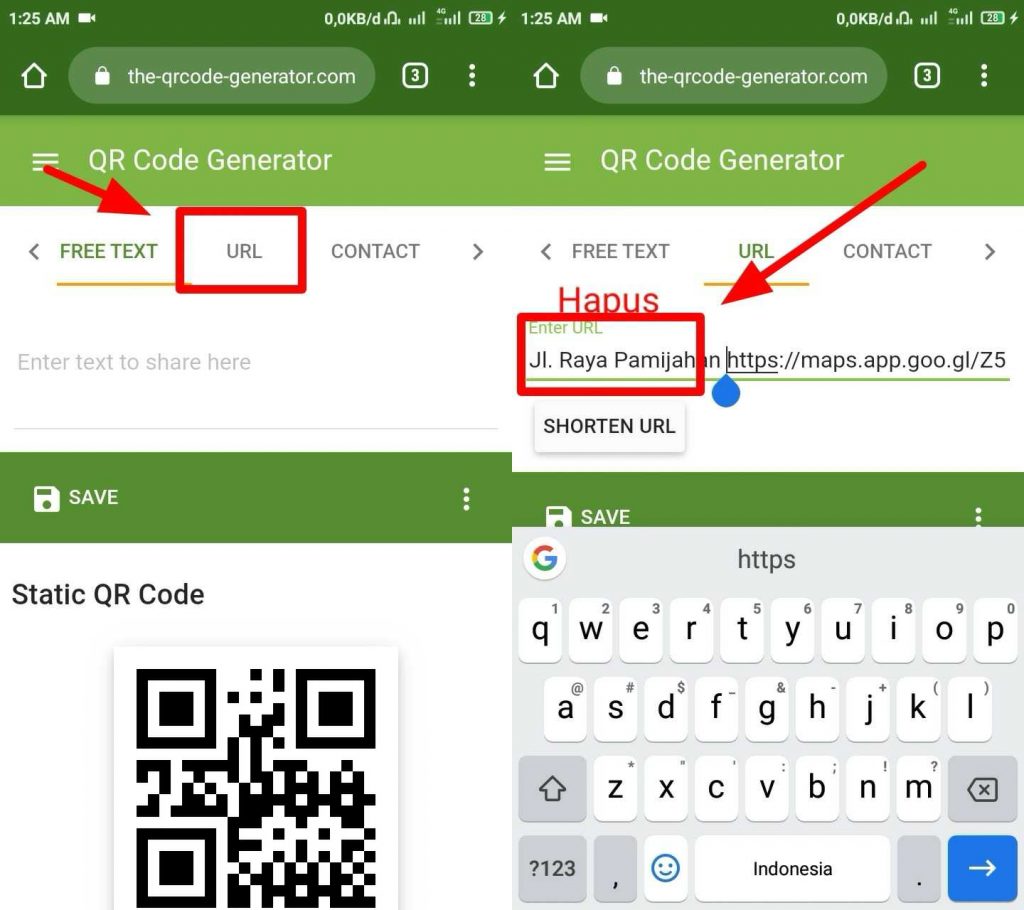 4. Disana terdapat beberapa menu pilihan yang bisa kamu gunakan. Karena yang kita copy dalam bentuk link, pilih saja menu link, lalu paste-kan link yang sudah disalin. Dan jangan lupa hapus alamat jalan pada awal link yang kamu salin supaya saat di scan akan otomatis dialihkan pada link Google Maps yang kamu maksud.