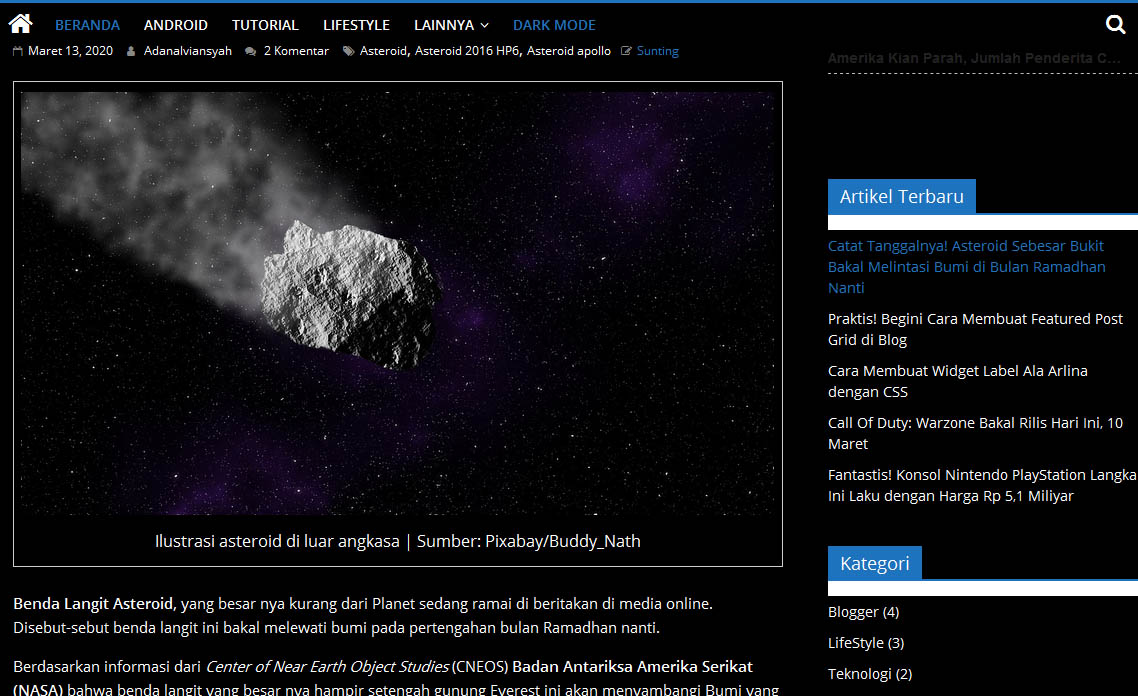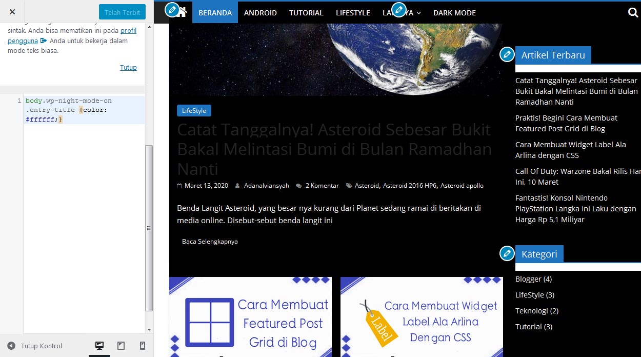 Berikut adalah tampilan Dark Mode yang telah terpasang di Blog WordPress.