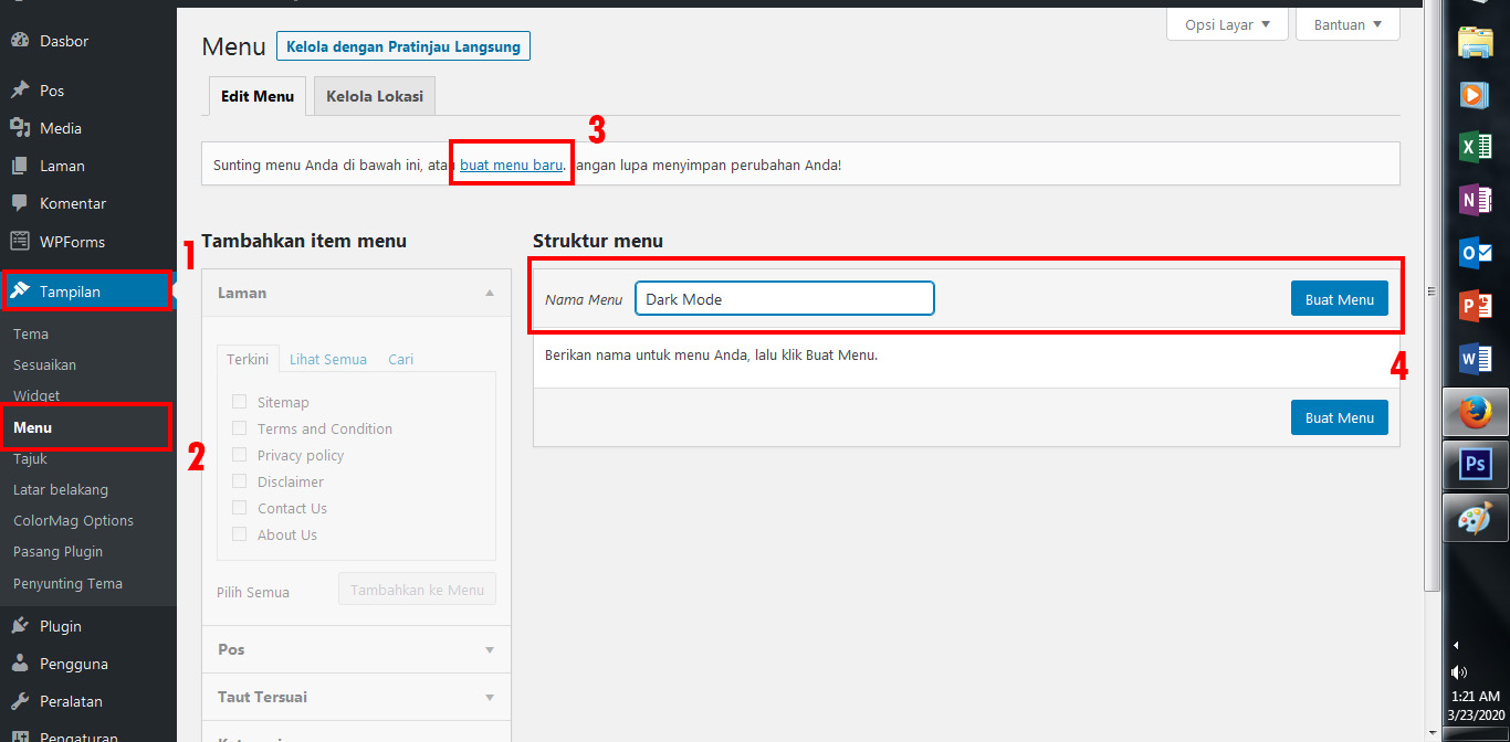4. Untuk cara mengaktifkan nya, silahkan kamu pilih menu Tampilan – Menu – Buat Menu Baru – Isi nama menu tersebut lalu pilih Buat Menu.