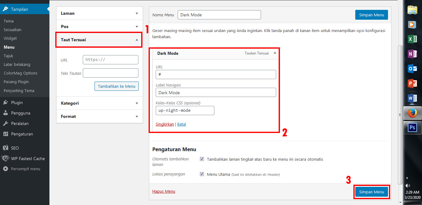 6. Setelah itu, kamu buat Custom Link dengan memilih menu Taut Tersuai di sisi kiri halaman. Isi kolom URL dengan Tanda Pagar “#” dan isi Teks Tautan dengan nama “Dark Mode”.