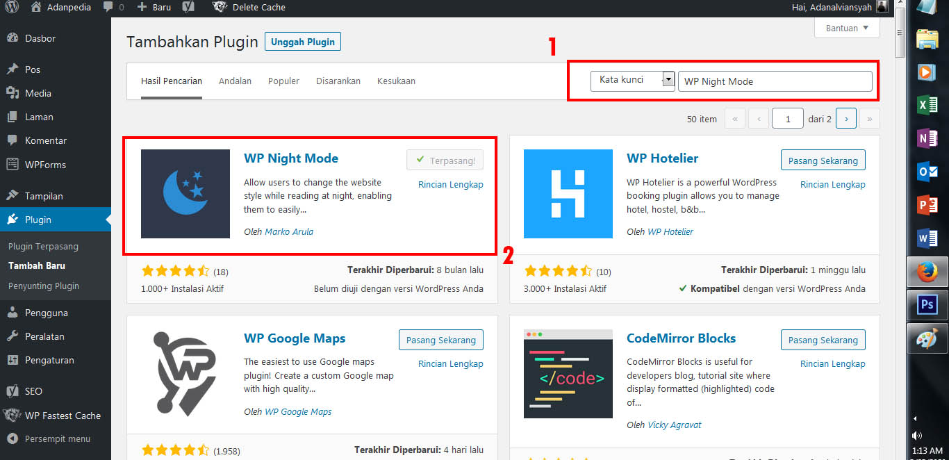 3. Pada kolom pencarian, masukan Keyword atau Kata kunci “WP Night Mode” – Lalu kamu unduh Plugin tersebut dengan klik Pasang Sekarang dan Aktifkan plugin nya.