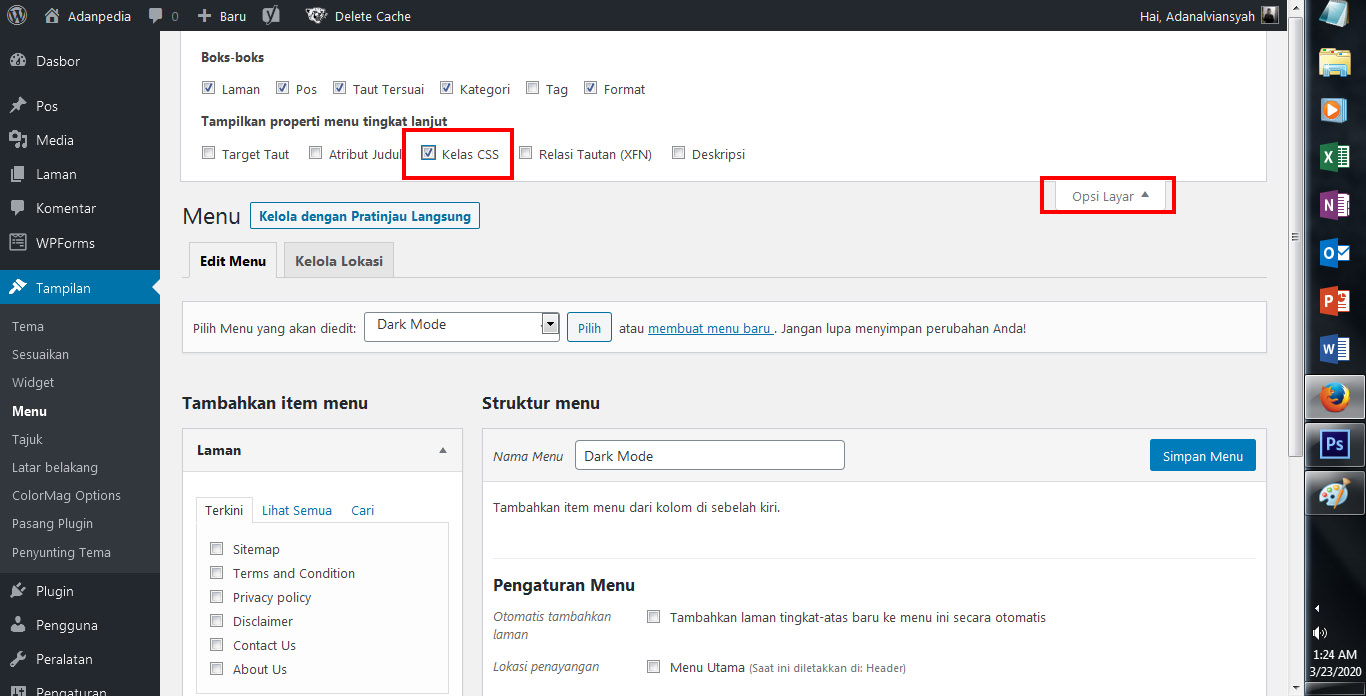 5. Selanjutnya kita akan menambahkan css nya. Oh iya, sebelum menambahkan css,-nya silahkan kamu pilih Opsi Layar dan centang kolom CSS Classes atau Kelas CSS.