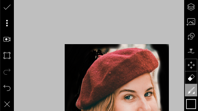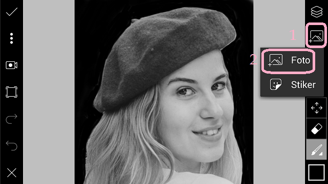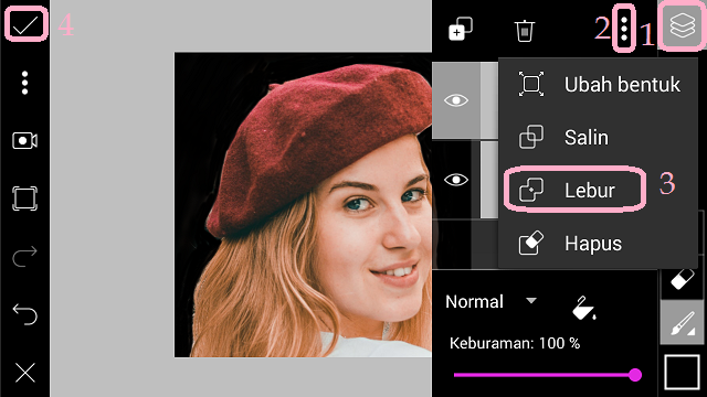 9. Bila kamu telah selesai mewarnai background pilih ‘Layer’ – tiga titik – ‘Marge’ untuk menyatukan background hitam dan foto. Klik centang.