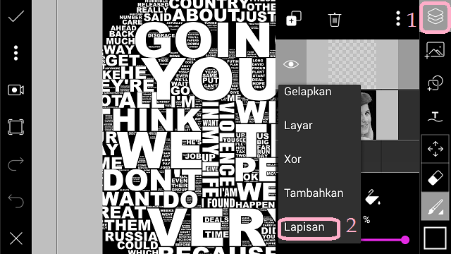 16. Satukan foto objek dan foto typography dengan pilih ‘Layer’ – tiga titik – ‘Merge’. Klik centang.