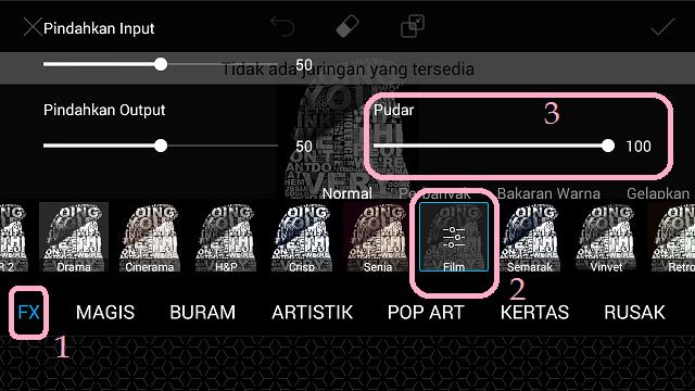 18. Pilih ‘FX’ – ‘Film’ – naikkan nilai ‘Fade’ menjadi 100. Klik centang.