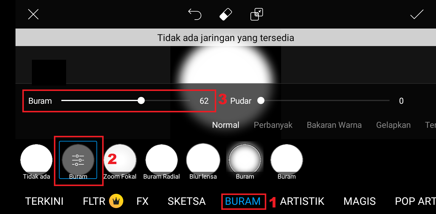 Pilih kategori efek ‘Buram’ – pilih ‘Buram’ – tambahkan nilai buram menjadi sekitar 62, dan kurangi nilai pudar menjadi 0. Klik centang.