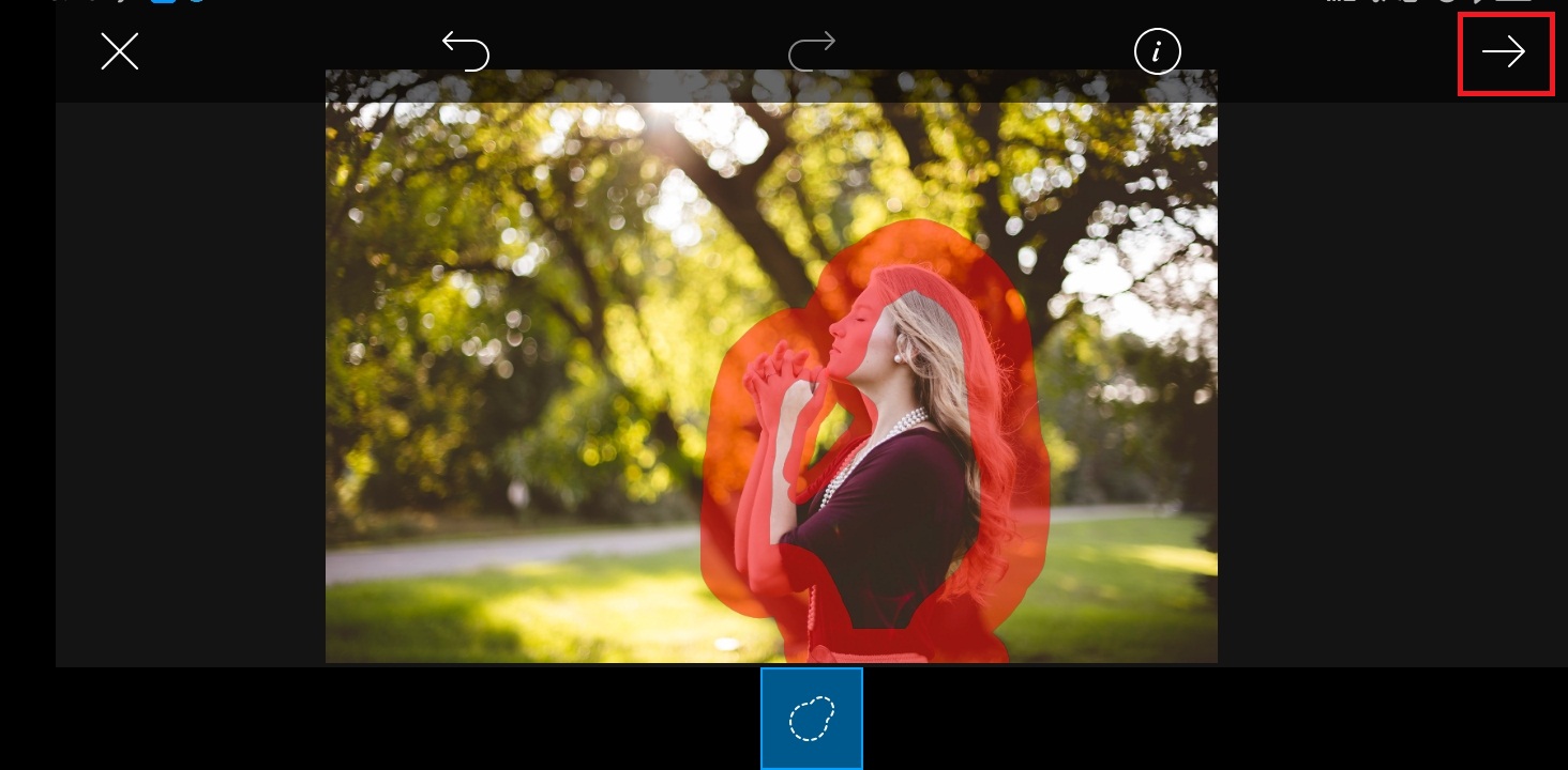 Seleksi object di foto, dan klik icon panah di pojok kanan atas.