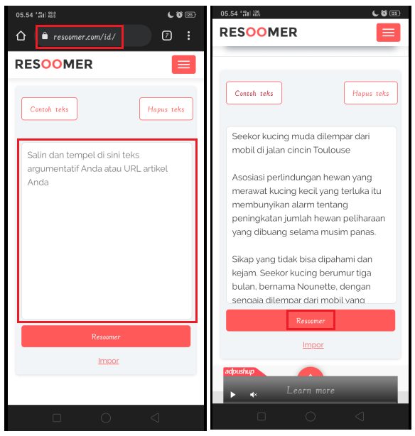 3. Salin atau Paste-kan tulisan yang sudah kamu copy sebelumnya pada kolom teks yang sudah disediakan. Selain, copy-paste tulisan kamu juga bisa memasukkan link url artikel kamu pada kolom teks tersebut. Bila sudah, klik tombol Resoomer untuk membuat kesimpulan otomatis dari tulisan/url artikel tersebut.