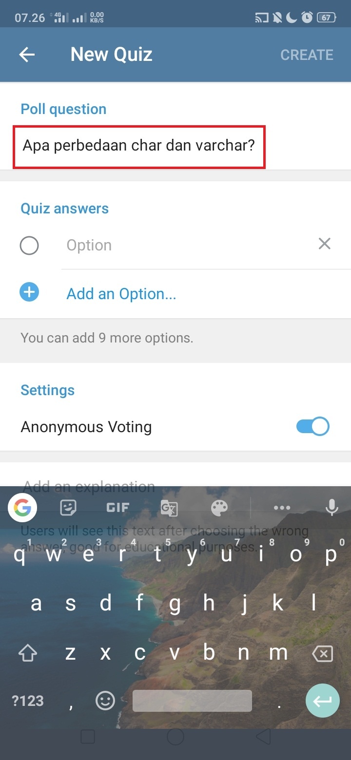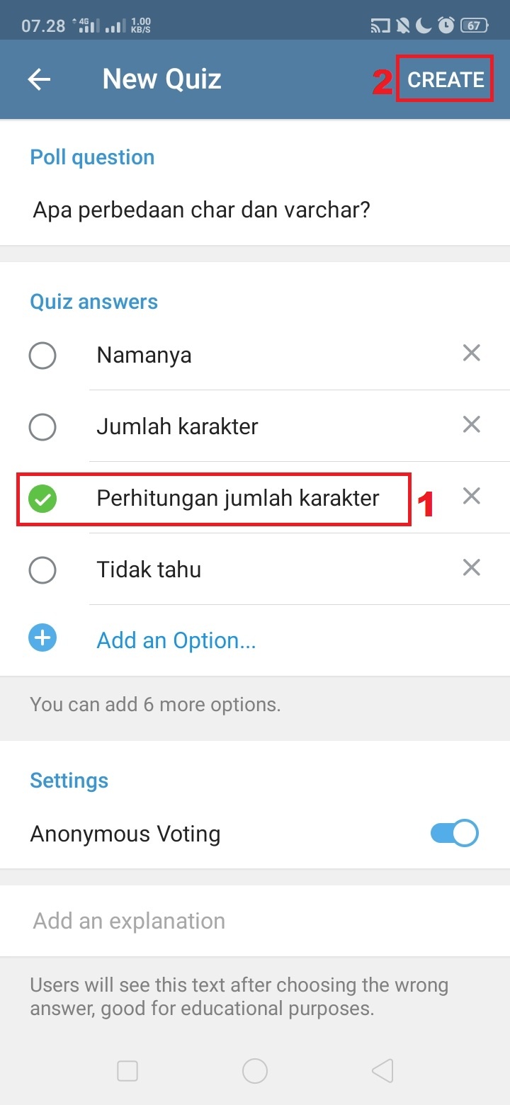 12. Pilih jawaban yang benar dan klik ‘create’.