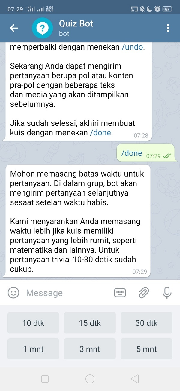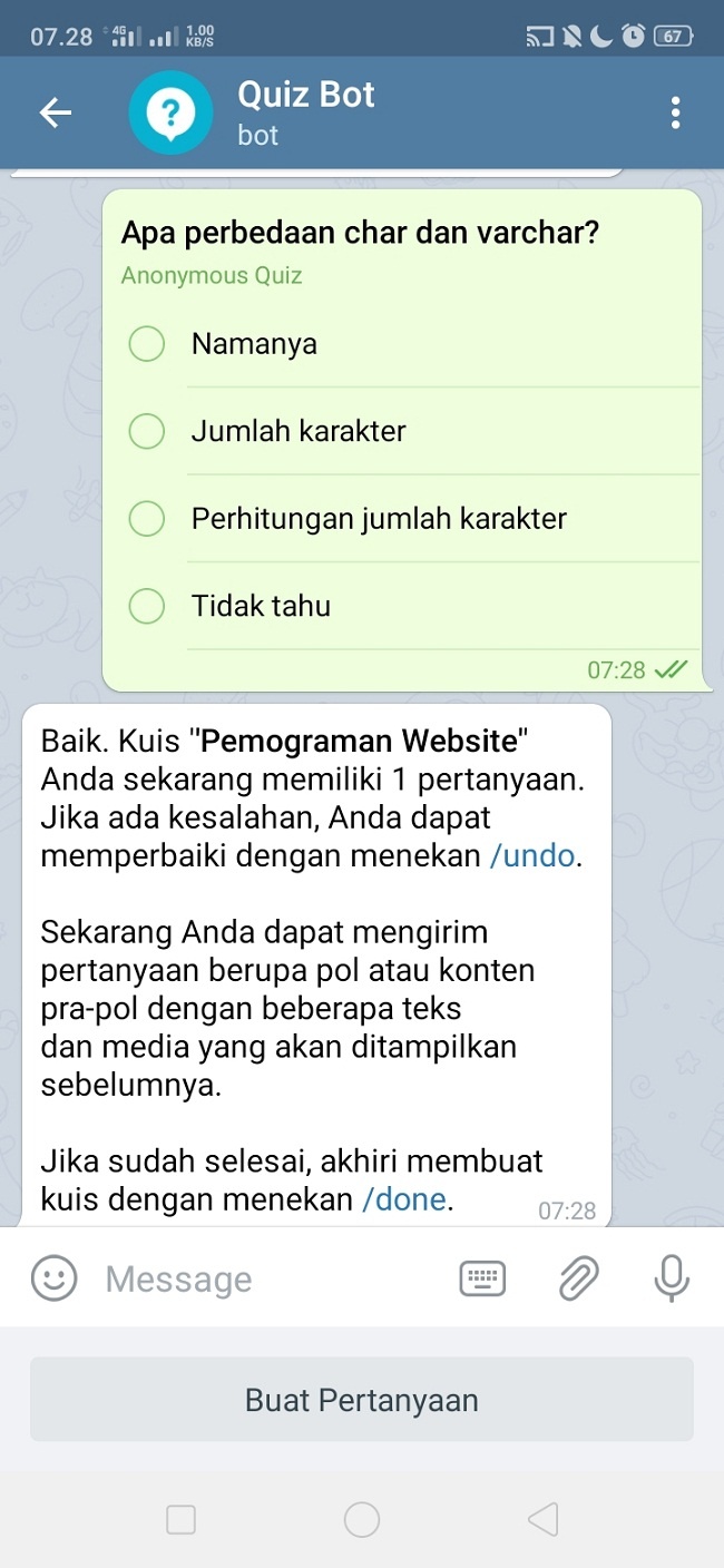 13. Berikut tampilan kuis. Untuk meng-edit kuis yang telah dibuat sebelumnya, ketikkan /undo. Untuk membuat pertanyaan lagi, klik tombol ‘Buat Pertanyaan’, dan ikuti langkah sebelumnya. Klik /done untuk mengakhiri membuat kuis. Disini saya akan memilih /done.