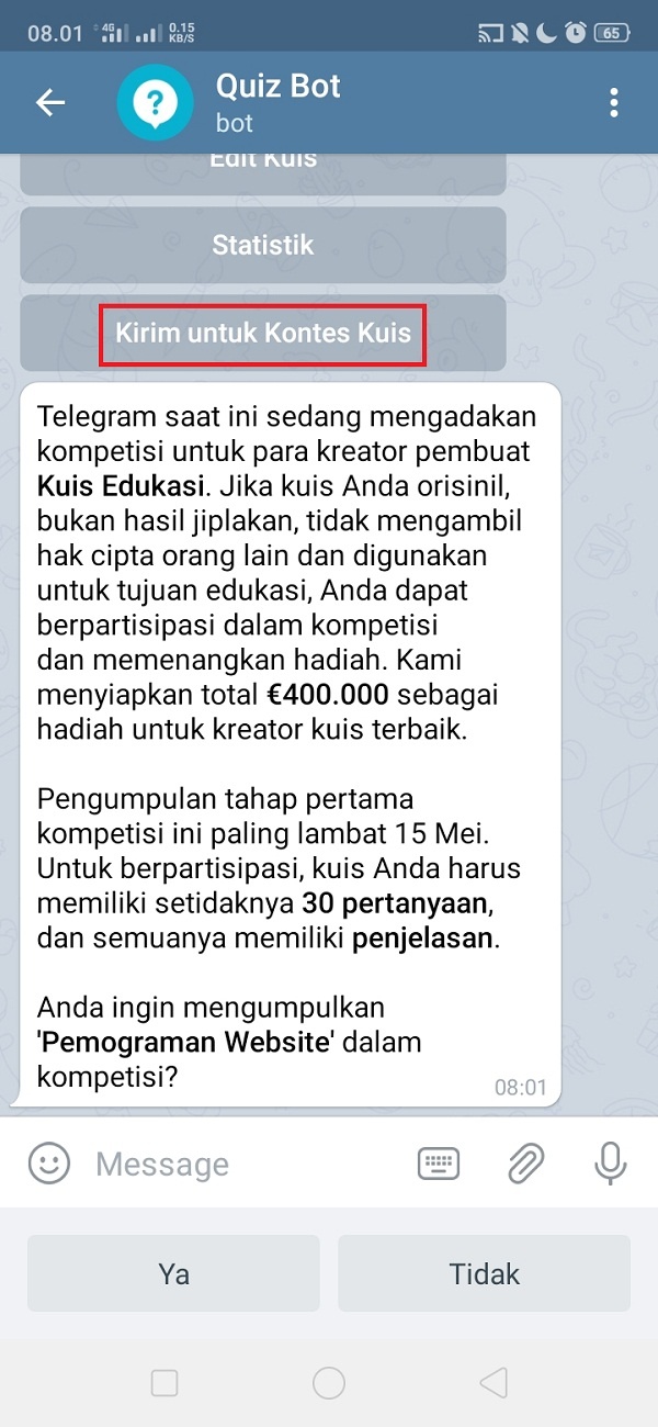 17. Telegram saat ini sedang mengadakan kompetisi membuat kuis edukasi. Total hadiah sampai €400.000. Buat 30 pertanyaan, dan klik tombol ya untuk mengirimkan kuis kamu ke kompetisi paling lambat tanggal 15 Mei 2020.
