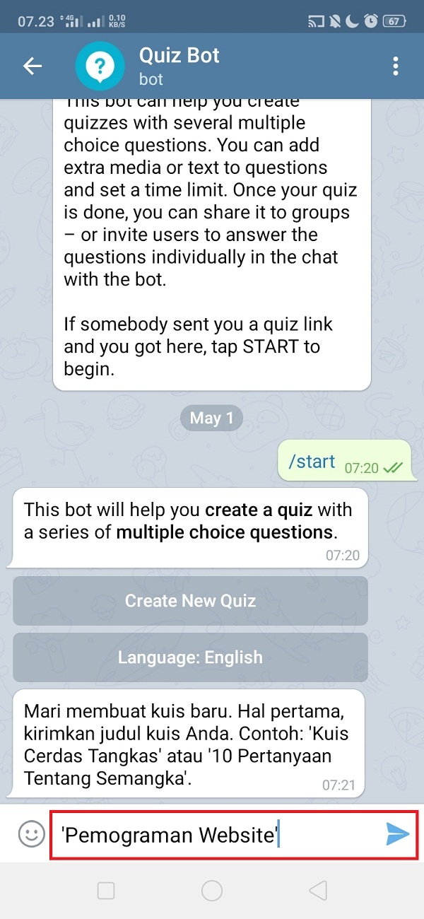 6. Pertama tulis judul kuis dengan tanda kutip (‘…’), klik ikon kirim.