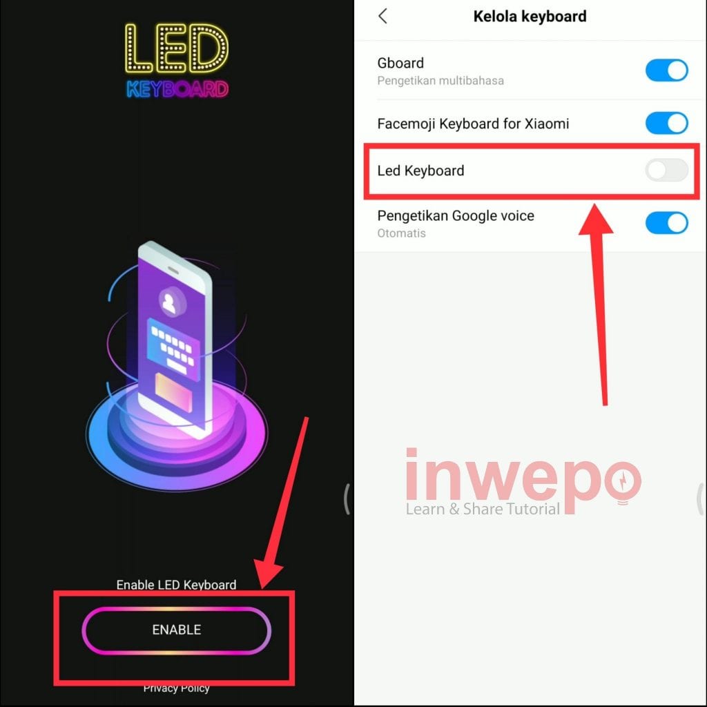 2. Buka aplikasi LED keyboard yang sudah kita download sebelumnya. Tap menu ENABLE kemudian pada menu Kelola Keyboard aktifkan LED Keyboard.
