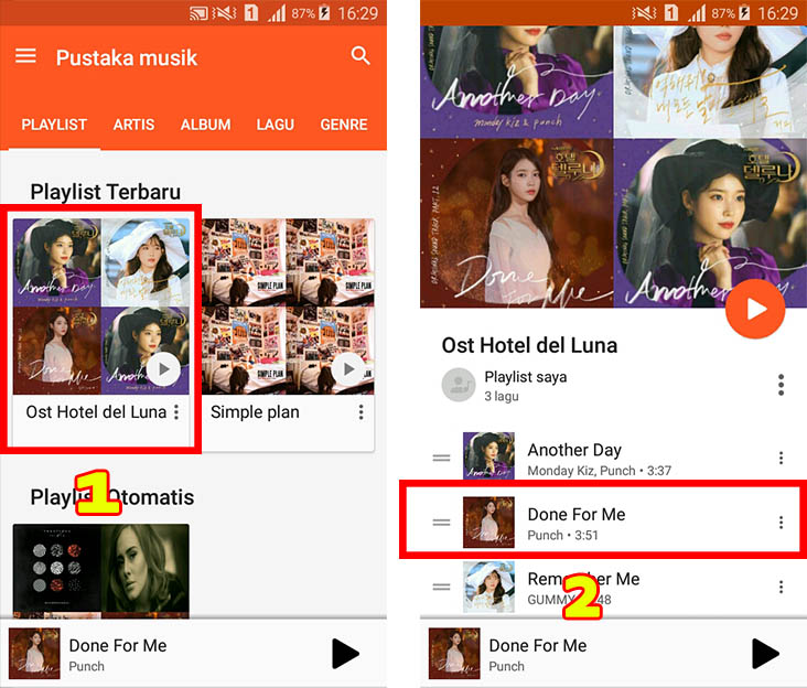5. Untuk menemukan playlist yang sudah dibuat, kamu hanya perlu mencari Pustaka Musik dan menekan playlist yang ada. Klik Judul Lagu untuk memutar lagu di dalam playlist.