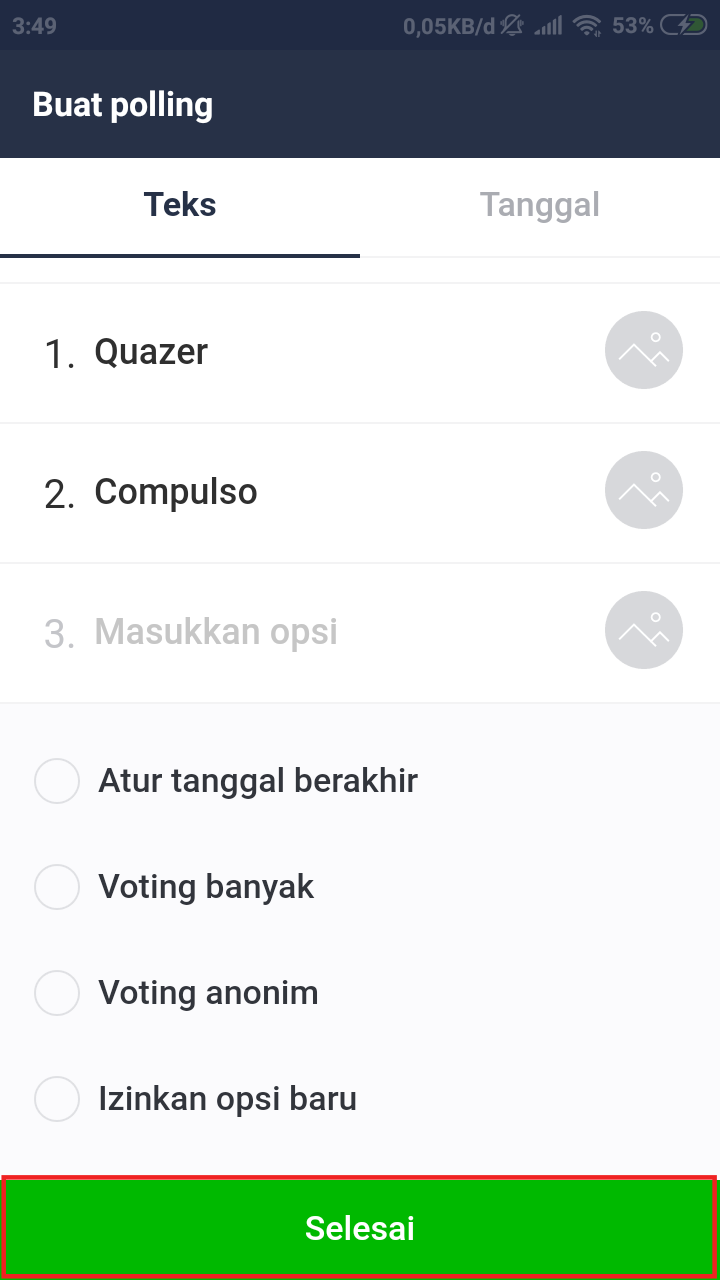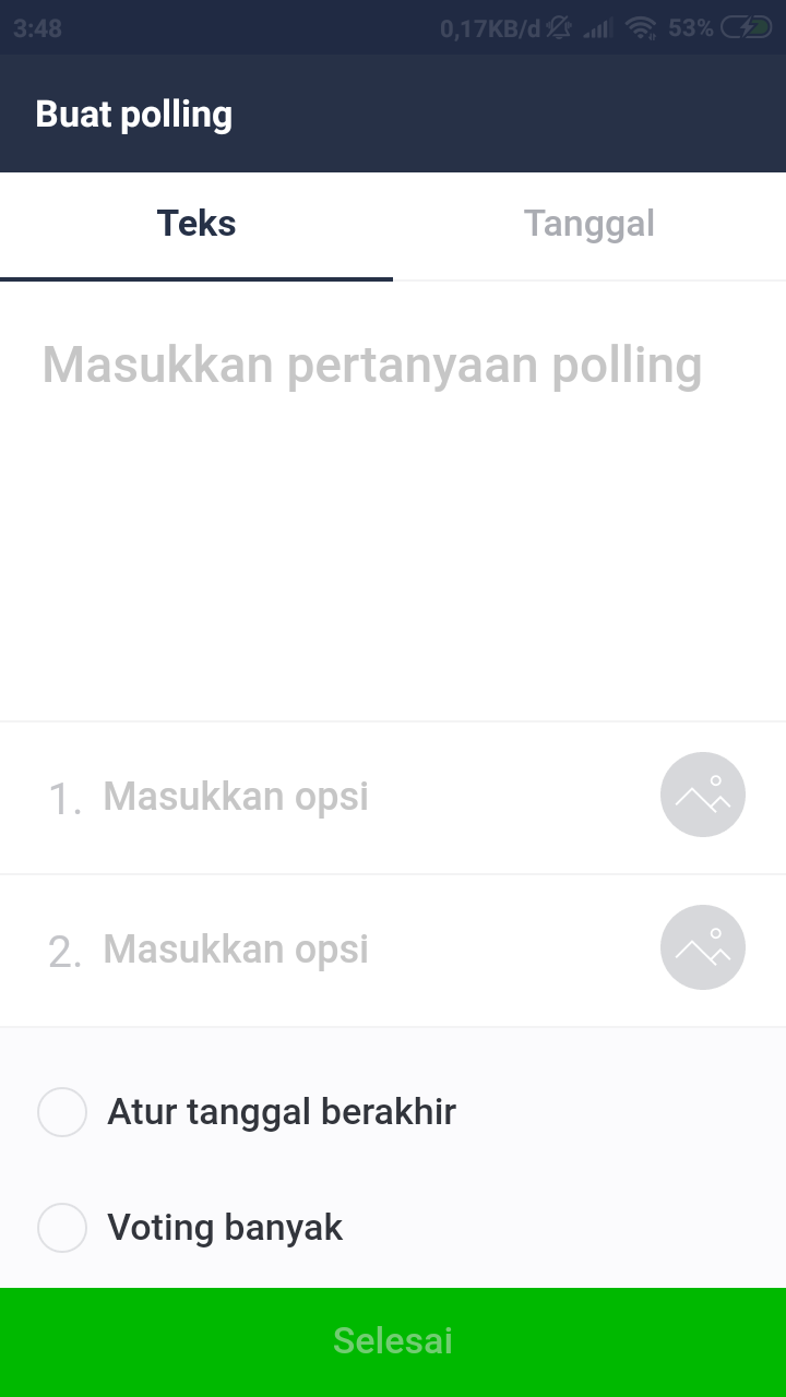 5. Lalu, pada halaman buat polling, pilih jenis polling yang ingin kita buat (untuk saat ini, hanya tersedia polling dalam bentuk teks dapat disertai dengan gambar atau tanggal). Setelah memilih jenis polling, masukkan teks serta opsi (/pilihan) yang tersedia pada polling yang akan kita buat.