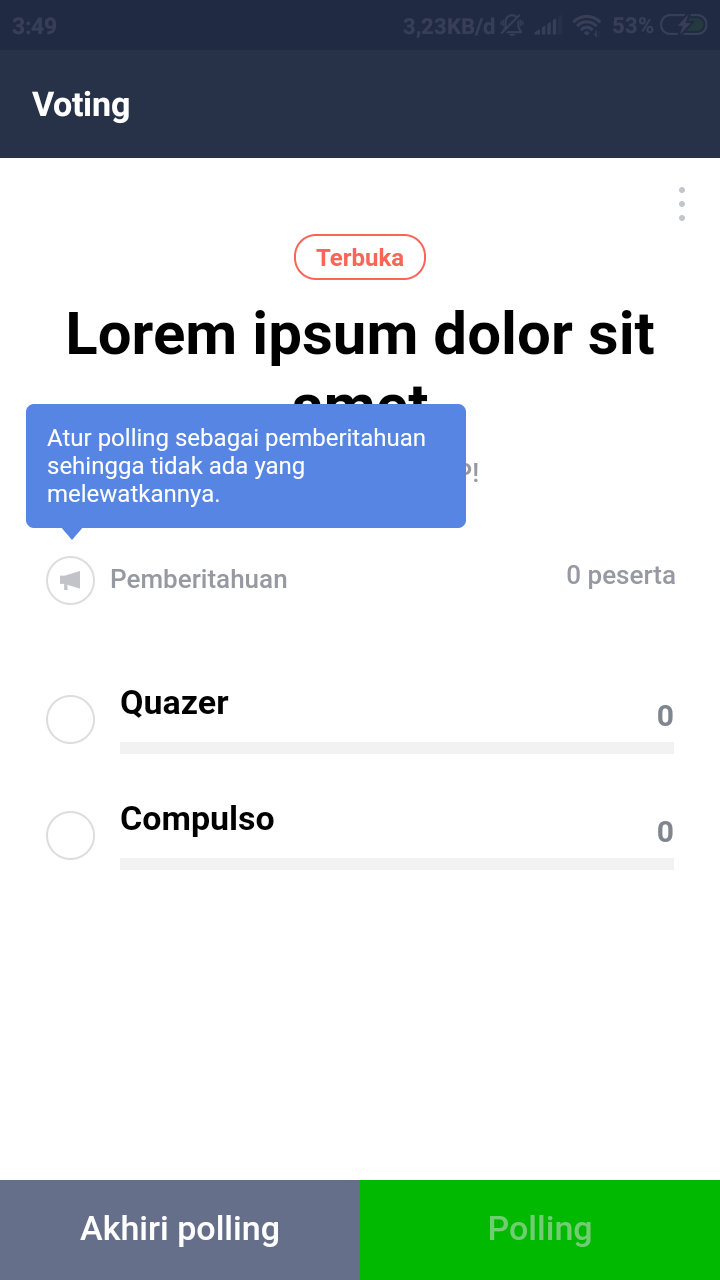 7. Setelah mengkonfirmasi pembuatan polling, polling akan langsung mengudara dan siap untuk digunakan. Adapun kita juga bisa menghimbau pengguna lainnya untuk melakukan polling (melalui kolom pemberitahuan) serta mengakhiri polling jika dirasa pemungutan suaranya telah selesai.