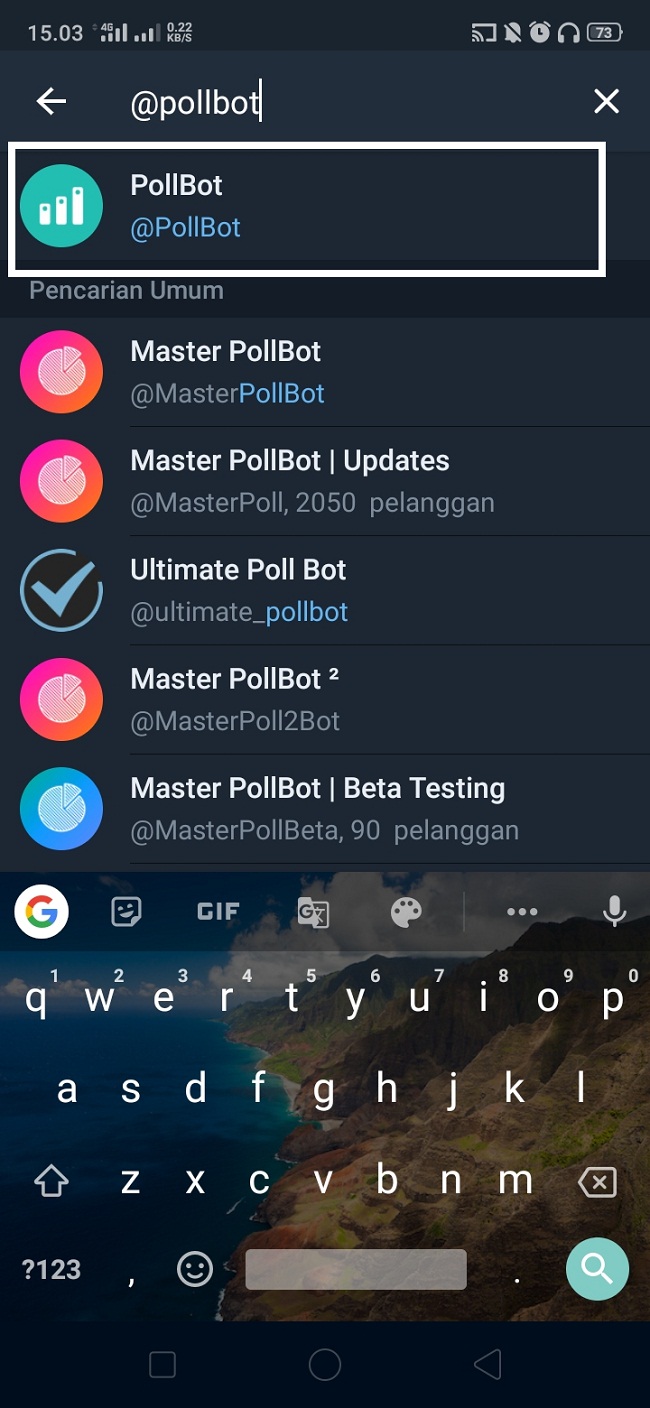 3. Ketikkan @pollbot, dan lihat hasil pencaharian. Pilih dan klik Pillbot. Icon diagram batang putih dengan background warna biru.