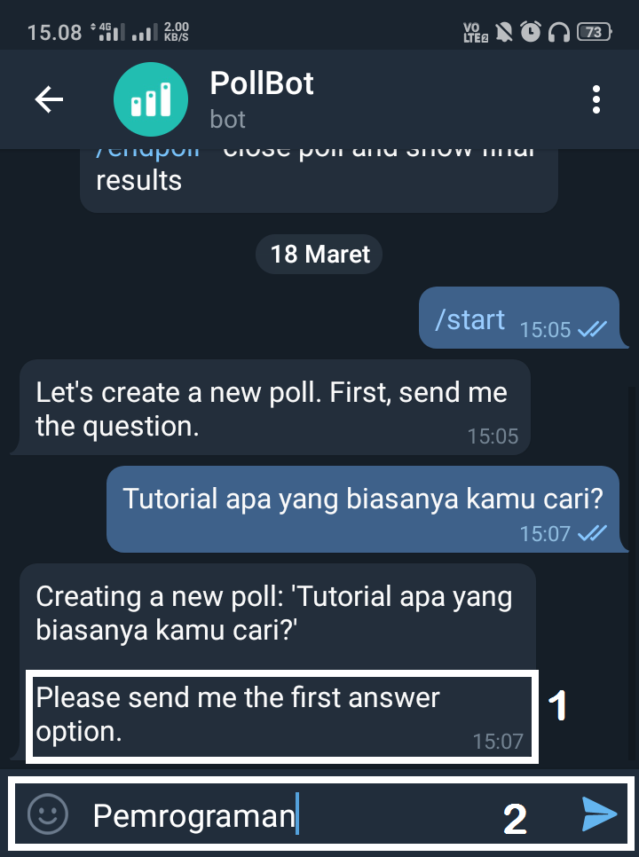 6. Akan muncul perintah memasukkan pilihan jawaban pertama. Ketikkan pilihan jawaban pertama, dan klik icon kirim.