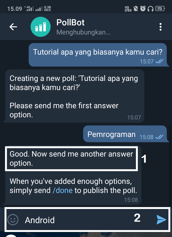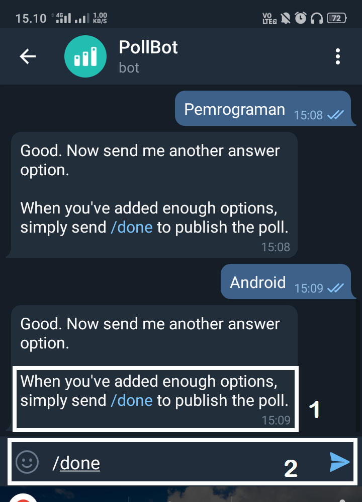 8. Setelah selesai memasukkan pilihan jawaban, ketikkan /done, dan polling kamu segera di publish.