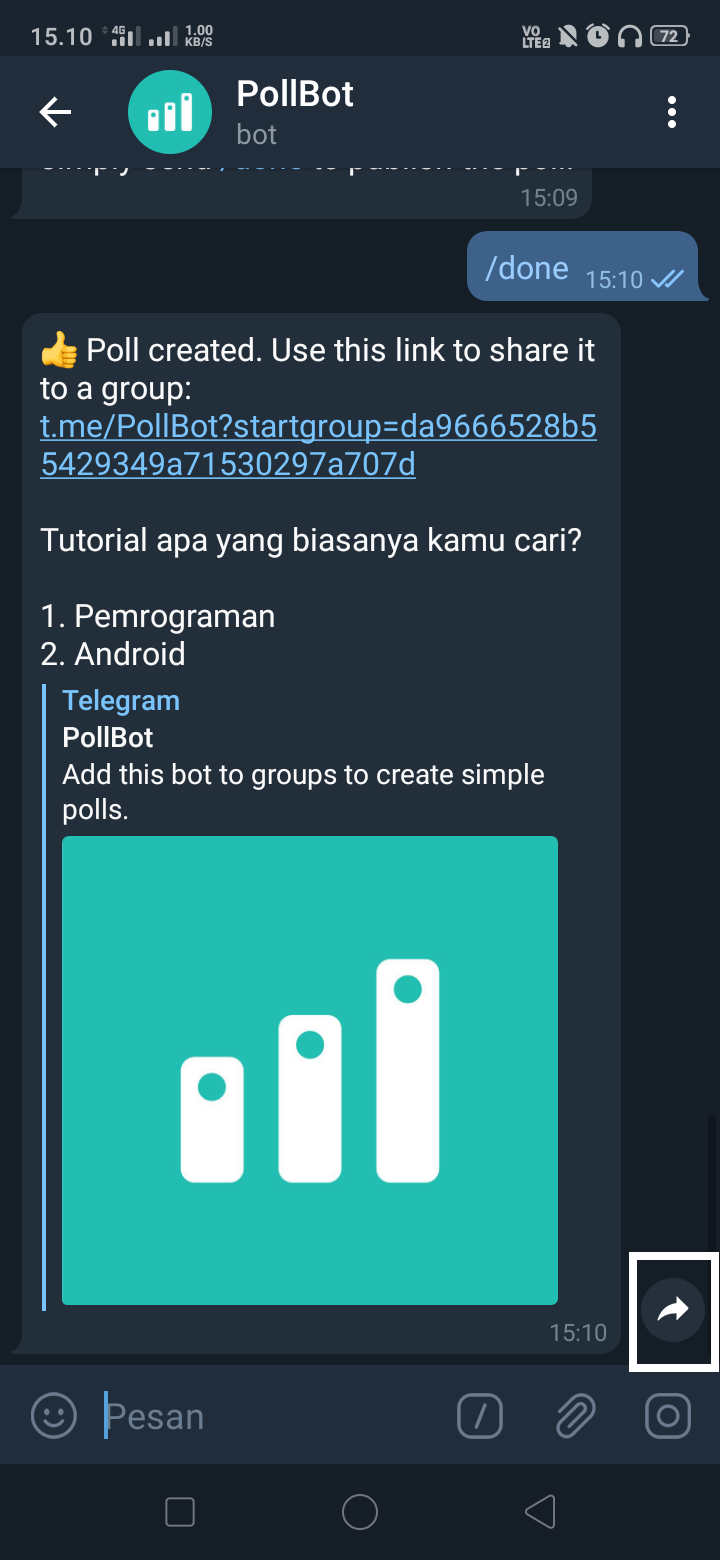 9. Salin url atau klik icon share untuk mengirim polling kamu ke grup Telegram.