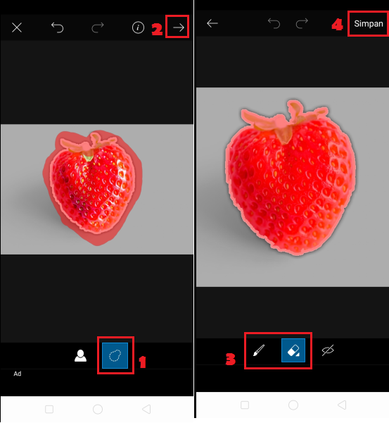 Seleksi objek stiker. Klik ikon gambar untuk menyeleksi objek stiker yang terhapus, dan klik ikon hapus untuk menghapus bagian background yang terseleksi. Klik simpan.