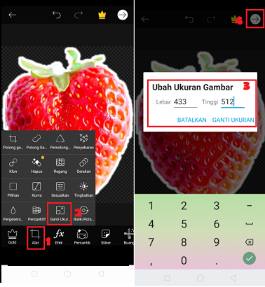 6. Ukuran maksimal stiker Telegram 512×512. Untuk mengecilkan ukuran stiker di PicsArt, klik ‘Alat’ – pilih ‘Ganti Ukuran’. Ubah ukuran menjadi 512, dan klik ‘Ganti Ukuran’. Klik ikon panah dipojok kanan atas untuk menyimpan stiker di galeri.