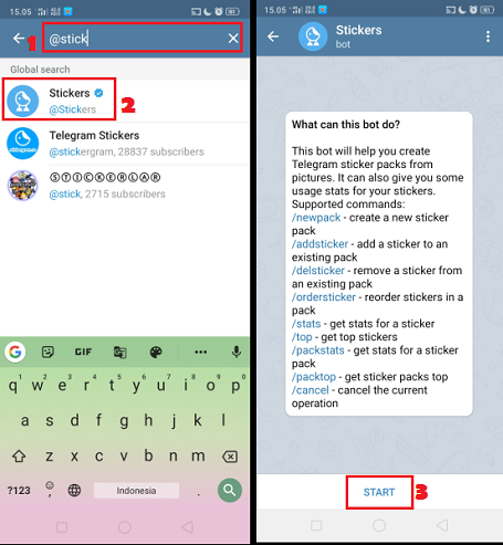 2. Klik ikon ‘Cari’ di pojok kanan atas, dan ketikkan keyword ‘@stiker’. Pilih dan klik Stikers. Klik tombol ‘Start’ untuk menambahkan stiker yang dibuat sebelumnya di Telegram.