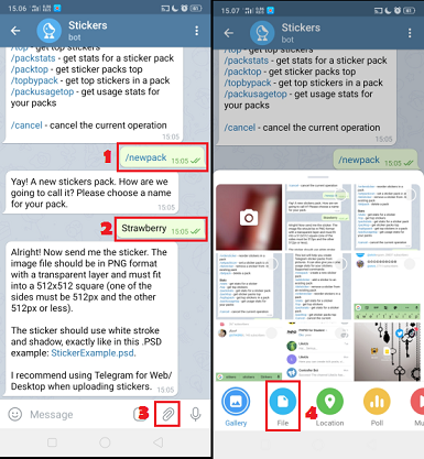 3. Ketikkan /newpack untuk membuat paket stiker baru. Ketikkan nama paket stiker. Klik ikon link untuk mencari foto stiker. Ambil foto stiker di file – pilih di Internal Storage – pilih di Pictures – pilih di PicsArt – pilih foto stiker. Ukuran stiker tidak boleh melebihi 350 kb.