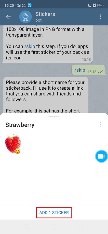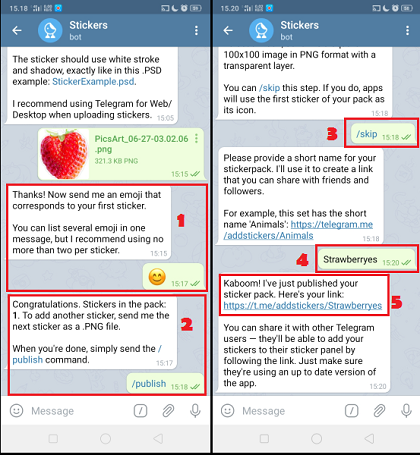 4. Kirimkan sebuah emoji untuk menyesuaikan dengan stiker. ketikkan angka 1 bila kamu ingin menambahkan stiker, namun ketikkan /publish untuk menampilkan stiker di Telegram. Ketikkan /skip. Buat nama pendek untuk stiker kamu dan klik kirim. Klik link, untuk membagikan stiker kamu ke pengguna Telegram yang lain.