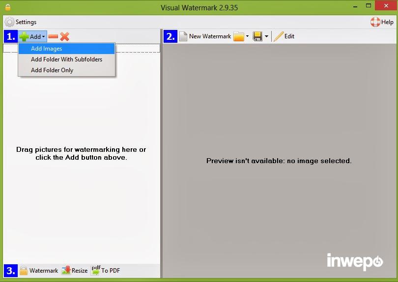 1. Lihat screenshot, Add foto pilih add images/add folder with subfolder/add folder only yang berisi foto yang ingin kamu buat watermark (bisa sekaligus banyak foto).
