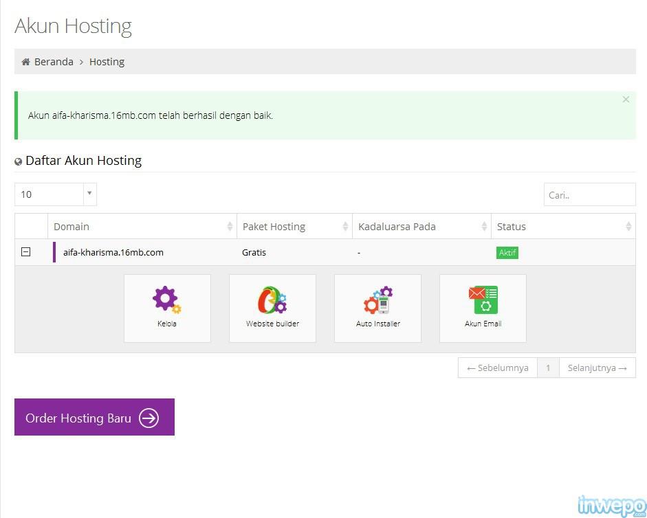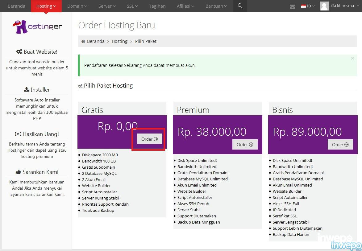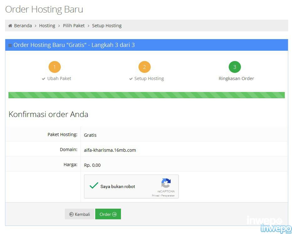 8. Kemudian konfrimasi hosting gratis pilih “order“.
