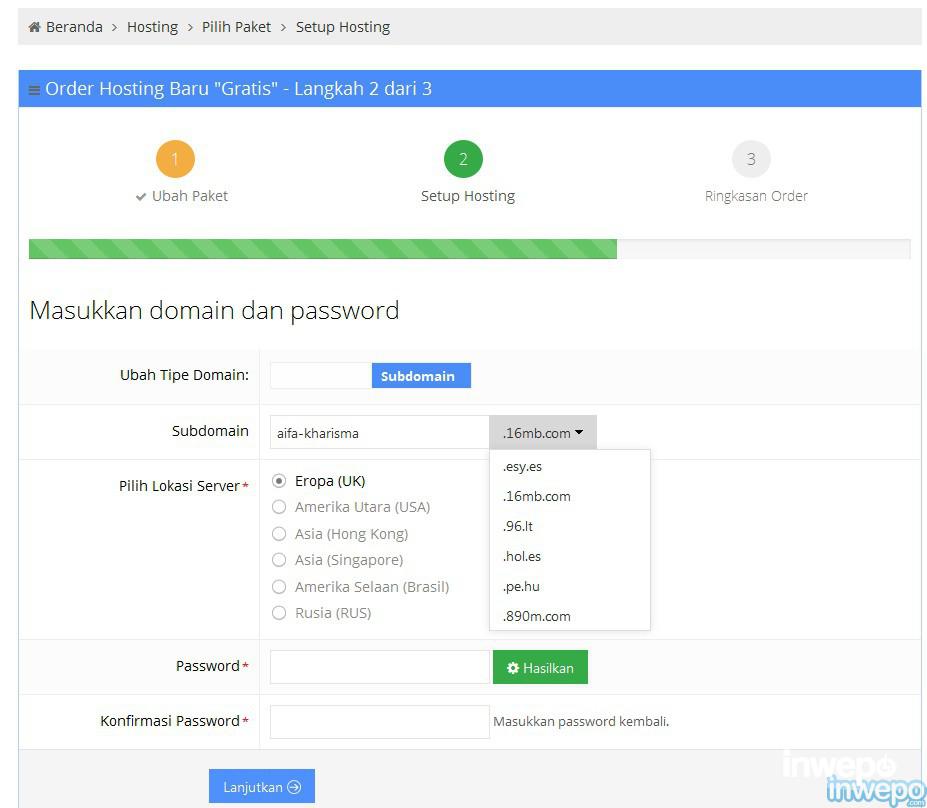 7. Masukan nama domain website yang kamu inginkan dan buat password baru. lalu lanjutkan.