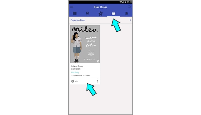 8. Buku yang dipinjam juga dibatasi waktunya, biasanya 2 – 3 hari. Untuk melihatnya, silakan kembali ke beranda, ketuk ikon rak dan pilih info.