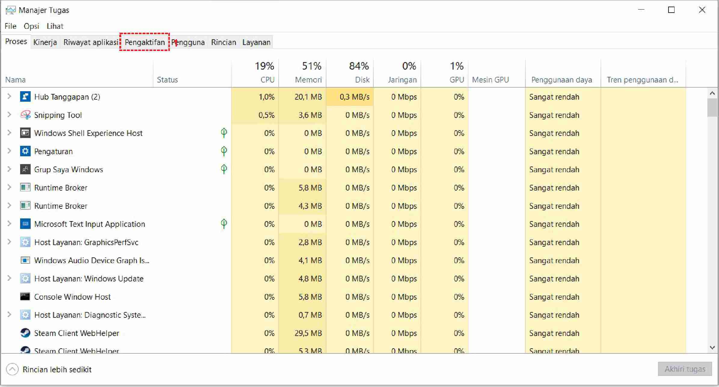 2. Setelah itu pada menu pengaturan windows task manager, pilih tab Pengaktifan / Startup.