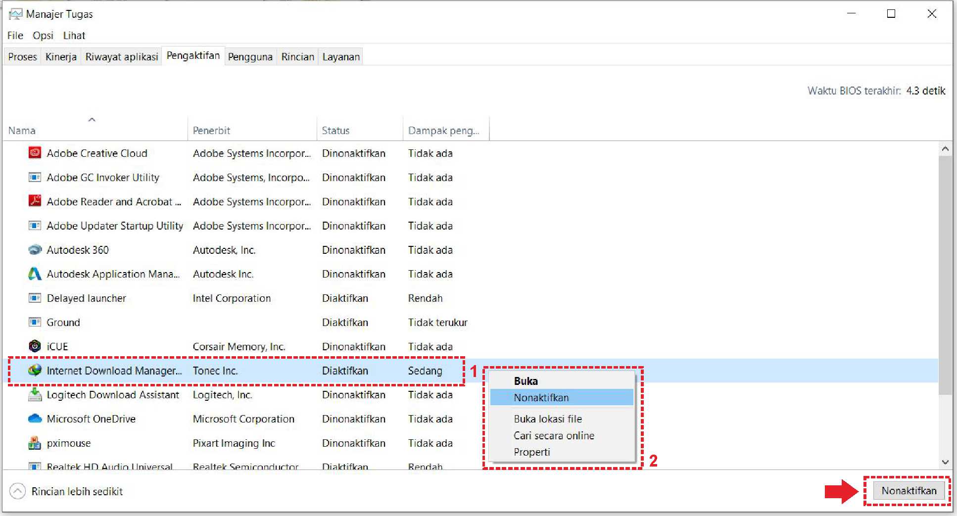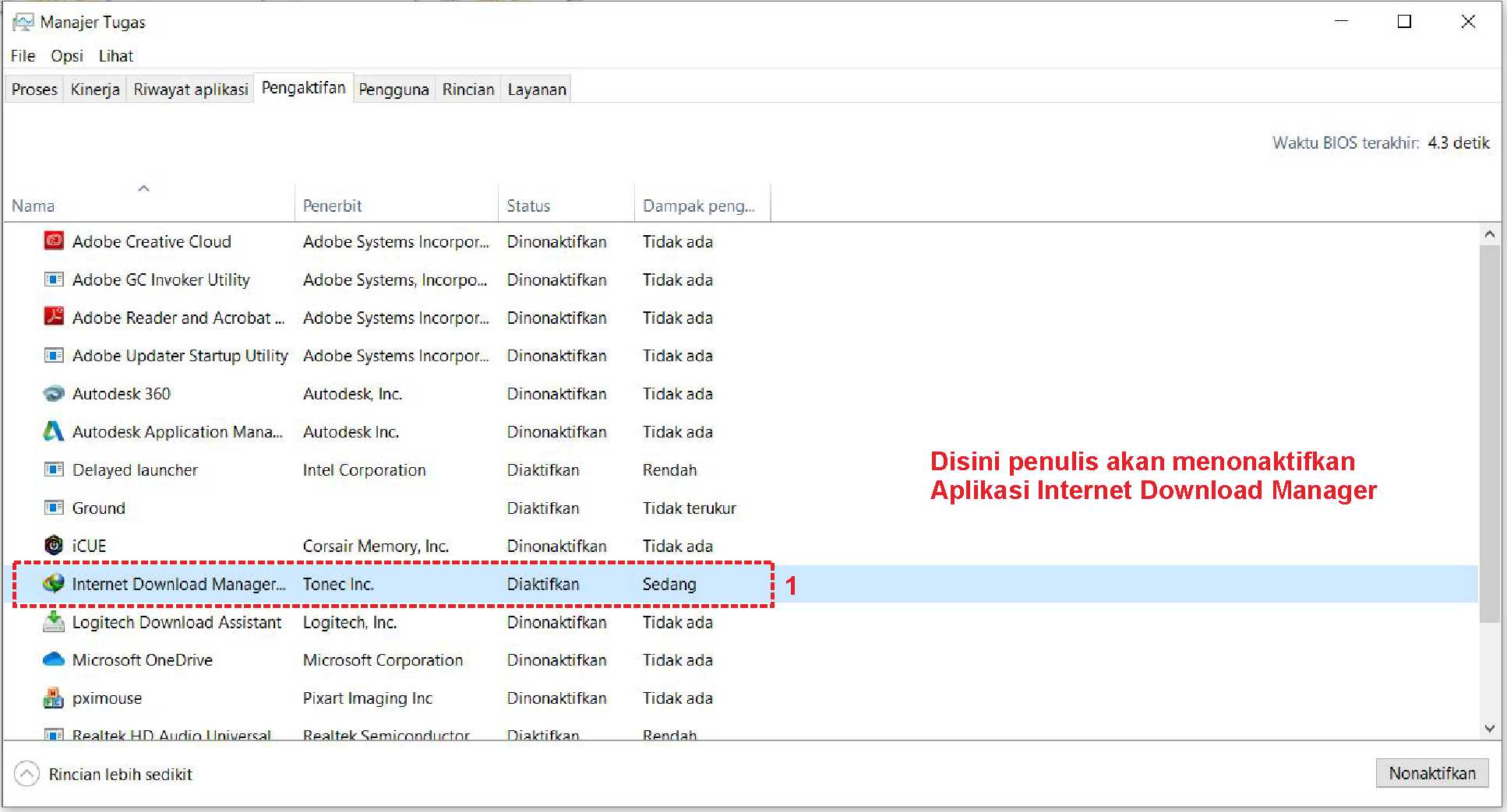 3. Pada menu tab pengaktifan, terdapat beberapa aplikasi yang melakukan booting pada saat perangkat dinyalakan. Selain itu dapat terlihat dampak penggunaannya apakah tinggi atau rendah. Disini penulis mencontohkan ingin menonaktifkan aplikasi Internet Download Manager. (Matikan / Disable beberapa aplikasi yang tidak penting dan yang memberatkan sistem operasi Windows kamu).