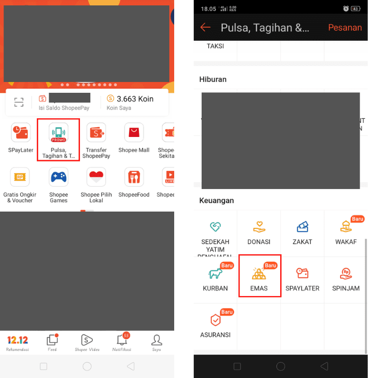 1. Buka aplikasi Shopee di perangkat android kamu, dan kemudian pilih menu Pulsa, Tagihan & Tagihan. Scroll kebawah pada halaman Pulsa, Tagihan dan Tiket dan kemudian cari menu Emas.