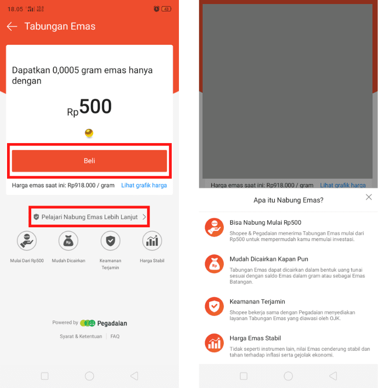 2. Disini kamu bisa mulai berinvestasi emas mulai dari Rp. 500,- saja. Kamu bisa langsung membeli emas mulai dari Rp. 500,- saja, tekan tombol Beli. Namun, sebelumnya tekan menu Pelajari Nabung Emas Lebih Lanjut untuk mendapatkan informasi lebih lengkap sebelum membeli emas.