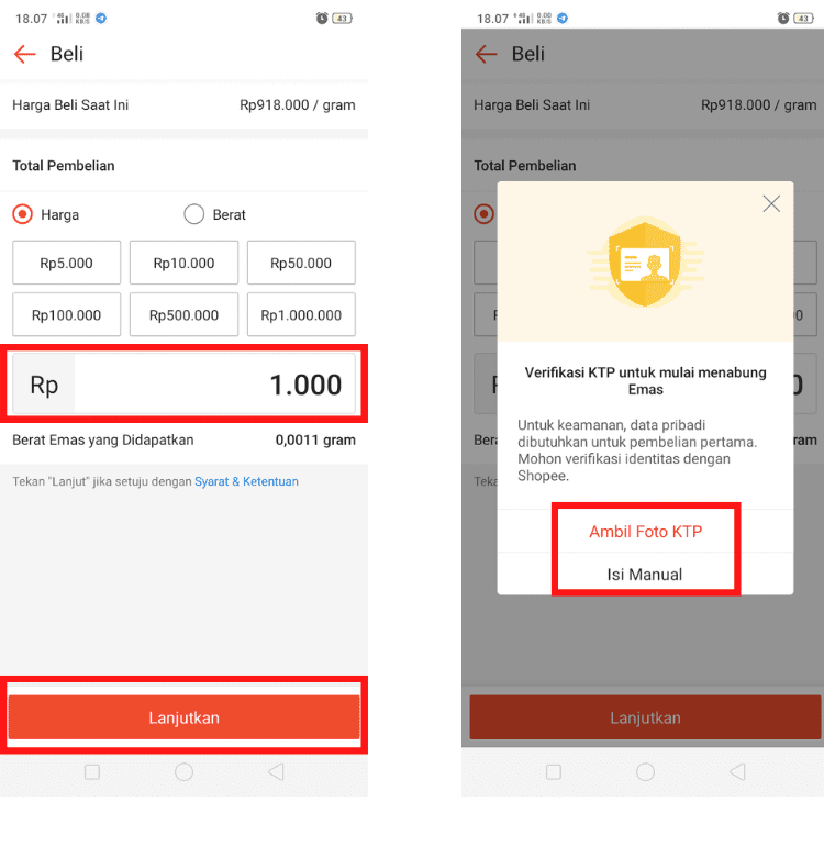 3. Disini kamu bisa membeli emas bedasarkan harga maupun berat. Pilih atau isikan nominal atau berat emas yang ingin kamu beli, dan tekan tombol Lanjutkan. Sebelum mulai menabung emas, kamu perlu melakukan verifikasi KTP terlebih dahulu. Pilih Ambil Foto KTP untuk mengisi form verifikasi secara otomatis atau pilih Isi manual untuk mengisi form verifikasi secara mandiri.